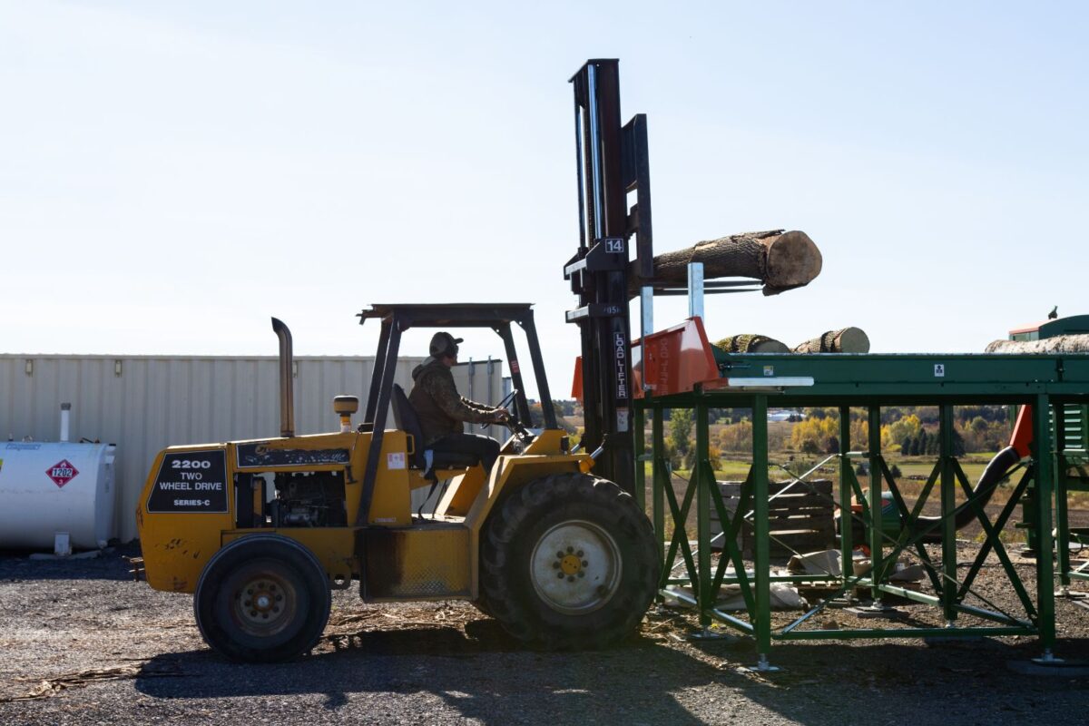 The process begins by receiving sustainably sourced high-quality wood from the Bancroft and Muskoka forests. The logs are delivered and prepared for firewood processing.